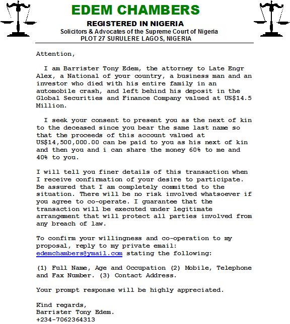 Attention: Kindly view the attached US$14.5m proposal. Your prompt response will be highly appreciated. Kind Regards, Tony Edem. ------------------------------------------------------------------------------------------------------------- IMPORTANT CONFIDENTIALITY NOTE: THE INFORMATION CONTAINED IN THIS FACSIMILE IS PRIVILEGED AND CONFIDENTIAL AND INTENDED FOR THE USE OF THE ADDRESSEE ALONE. THE ADDRESSEE IS HEREBY NOTIFIED THAT ANY DISSEMINATION, DISTRIBUTION OR COPYING OF THIS FACSIMILE IS STRICTLY PROHIBITED. IF THE FACSIMILE IS RECEIVED IN ERROR, PLEASE IMMEDIATELY NOTIFY ME BY EMAIL OR FAX.