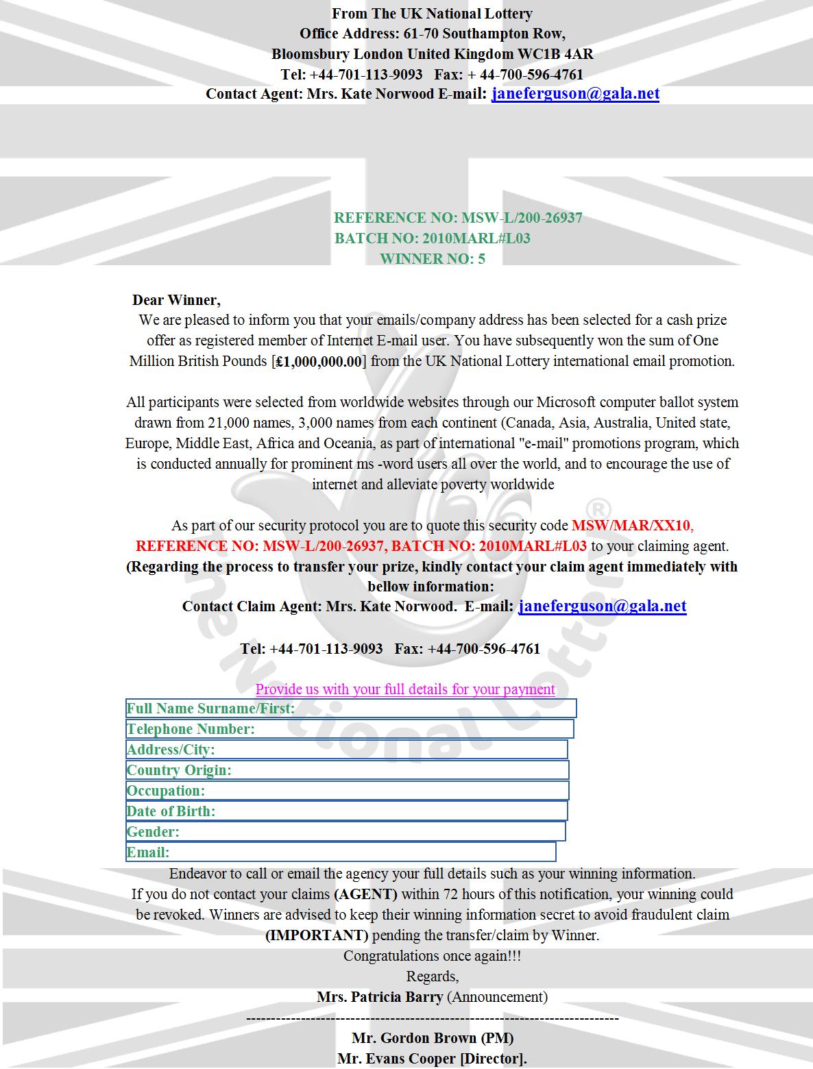 An Email with the Subject "W.NOTIFICATION" was received in one of Scamdex's honeypot email accounts on Wed, 28 Apr 2010 03:36:08 -0700 and has been classified as a Lotto/Lottery Scam Email. The sender shows as BRITISH LOTTO <euro.million81@dslextreme.com>.