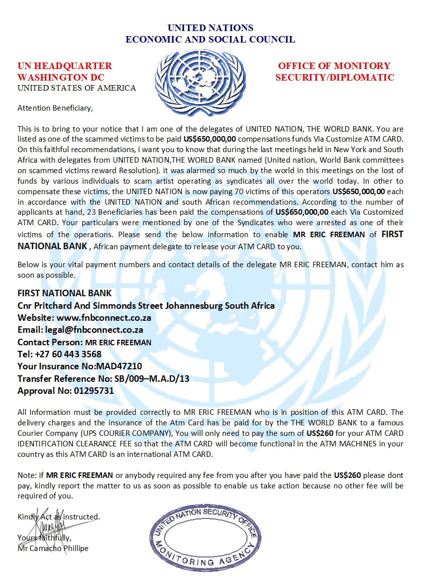 An Email with the Subject "UN URGENT PAYMENT INSTRUCTION" was received in one of Scamdex's honeypot email accounts on Wed, 06 Nov 2013 14:18:55 -0800 and has been classified as a Employment/Job Scam Email. The sender shows as "UN"<info@un.org>.